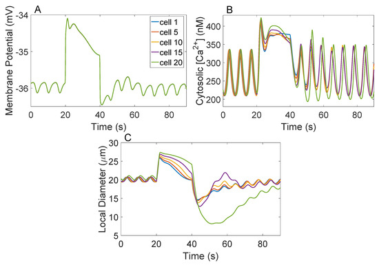 Predicted time profiles of (A) membrane potential; (B) cytosolic Ca concentration; and (C) local diameter for five cells in the afferent arteriole at an inflow pressure pulse increase to 140 mmHg. For clarity, we only show one in 5 cells along the AA; the behavior of neighboring cells is summarized in Section 3.2.