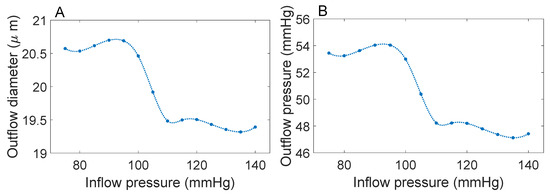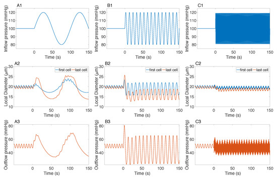 The amplitude of the outflow pressure is larger or equal to the inflow amplitude A for small frequencies and decreases as the inflow frequency f increases. When the inflow frequency Hz, for mmHg, the outflow amplitude converges to approximately mmHg, and for mmHg, the outflow amplitude converges to approximately mmHg. Thus, for smaller inflow frequencies f, the sinusoidal perturbation leads to irregular oscillations in the local vascular diameters and outflow pressure, and for large inflow frequencies f, the perturbation leads to sustained vasoconstriction [6,20,21,55]. According to the analyses in [26], this behavior is expected since, due to absence of tubuloglomerular feedback (TGF) in the present formulation, dynamic autoregulation at low frequencies f is not incorporated.