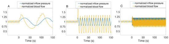 Normalized inflow pressure and normalized blood flow when a sinusoidal perturbation is applied to the inflow pressure with amplitude mmHg and frequency (A) 0.01 Hz; (B) 0.1 Hz; and (C) 1 Hz.