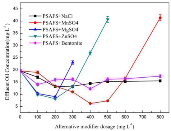 As can be seen in Figure 2, after using these alternative-modifier composite PSAFS to treat 5000 ppm emulsified oily wastewater, magnesium sulfate, zinc sulfate, and manganese sulfate could make the effluent oil concentration below 15 mg·L−1, so the deoiling effect was significant. When the dosage of magnesium sulfate and zinc sulfate was 200 mg·L−1, the oil concentration was reduced to 12.75 mg·L−1 and 12.17 mg·L−1, and when the dosage of manganese sulfate was 400 mg·L−1, the oil content in the effluent reaches 10.51 mg·L−1; this amount was more significant than magnesium sulfate and zinc sulfate. The addition of sodium chloride and bentonite had no noticeable demulsification effect on the oily wastewater. According to the results, we chose magnesium sulfate, zinc sulfate, and manganese sulfate as the modifiers.