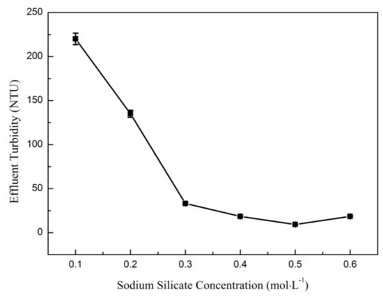 As shown in Figure 3, when the concentration of sodium silicate was less than 0.5 mol·L−1, PSAFS had better a demulsification effect on emulsified oil wastewater as the concentration of Si ions increased. However, the effect gradually weakened as the concentration of Si ions continued to increase. It was found that when the concentration of Si ions was too low, PSAFS would gel in a short time, so that the curing process was affected, and the effect of demulsification was much lower than that of PSAFS with high Si concentration. It may be because when the concentration of sodium silicate was low, the requirement of low-concentration sodium silicate solution grew to prepare the same quality of PSAFS, which diluted the concentration of PSAFS solution. In the same volume of PSAFS, the concentration of Fe and Al ions, which play critical roles in demulsification, was much lower than that of PSAFS prepared with the higher concentration of sodium silicate solution. So we chose to use 0.5 mol·L−1 sodium silicate solution for developing the activated silicic acid.