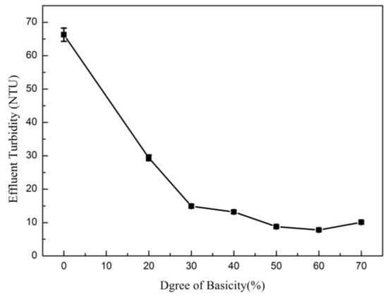As the degree of basicity increased, the polymerization of PSAFS would increase accordingly. However, when the degree of basicity was too high, the coagulant would generate a significant amount of high polymer after hydrolysis, which would reduce the formation of multinuclear hydroxy complexes of aluminum and iron, thereby significantly decreasing the stability of the coagulant, the phenomena of wall-hanging and poor flocculation would occur during the treatment process. When the alkalinity was too low, the molecular chain of PSAFS was short, and the degree of polymerization was low, so its adsorption and bridging effect were reduced. We analyzed the turbidity-removal effect when the basicity value ranged from 30% to 70%; from an economical point of view, the degree of basicity of the coagulant we chose in this test was 50%.