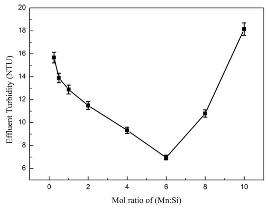 Figure 5 shows that when nMn:nSi was 6:1 and 4:1, Mn-PSAFS had a good demulsification and turbidity-removal effect on emulsified oil wastewater. Especially at 6:1, the effluent turbidity could be reduced to 6.96 NTU. As the nMn:nSi ratio decreased, the demulsification and turbidity-removal effect of Mn-PSAFS gradually decreased. This was because when a small amount of manganese salt was introduced, the divalent manganese ion was easily oxidized and could not form effective coordination with the activated silicic acid, so an effective flocculating component could not be created. That was why, when the manganese ion content in the coagulant was low, the flocculation effect was weak. When the ratio of nMn:nSi increased, Mn-PSAFS gradually increased demulsification and turbidity-removal capacity; this was because the surface of manganese salt had abundant surface hydroxyl groups. Its introduction made Mn-PSAFS able to form a more compact fibrous structure. As the effective coordination of the manganese ions and the activated silicic acid caused the coagulation agent to accumulate more charge, the entrapment and sweeping of the coagulant, the neutralization ability, and the stability of the coagulant were enhanced. Also, although the introduction of manganese salt improves the settling performance of flocs, excessive manganese ions would affect the coordination of aluminum, iron, and activated silicic acid, reduce the content of aluminum and iron ions in coagulant, and weaken the coagulant demulsification and oil-removal ability. Based on the experimental results, we chose nMn:nSi to be 6:1.