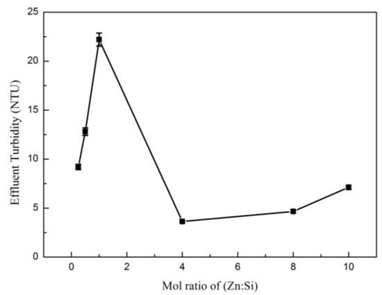 As Figure 7 shows, when the value of nZn:nSi was between 4 and 8, Zn-PSAFS had a good effect on demulsification and turbidity removal of emulsified oil wastewater. With the increase of dosage of coagulant, its treatment effect gradually increased, and the effluent turbidity decreased. When the dosage was 1.2 mg·L−1, the treatment effect was the best. At that time, the concentration of Zn-PSAFS polymer in the reaction system was higher, and the collision probability between the colloidal particles was substantially increased, which was favorable for the adsorption and bridging between the colloidal particles. When the value of nZn:nSi was small, the amount of flocs formed after Zn-PSAFS was dissolved was too small. When the value of nZn:nSi was high, the activated silicic acid could not be fully utilized, which affected the polymerization degree of the coagulant.