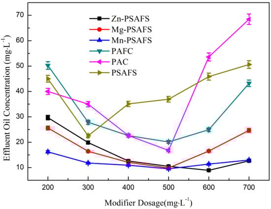 Figure 8 shows that the demulsification and oil-removal effects of Mn-, Mg-, and Zn-modified PSAFS coagulants on emulsified oil wastewater were better than those of commercially available PSAFS, PAC, and PAFC. The effluent oil concentration after treatment could be reduced to less than 10 mg·L−1.