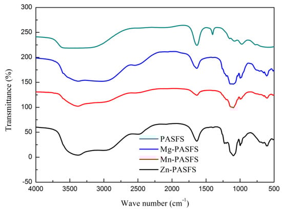As can be seen from the Figure 9, the spectra of PSAFS, Mn-PSAFS, Mg-PSAFS, and Zn-PSAFS are the same, with high light transmittance absorption peaks near 3200 cm−1~3600 cm−1, 3390 cm−1 and 3310 cm−1, respectively, which was the vibrational absorption peaks of -OH group. Fe, Al, metal Mn/Mg/Zn ions, and their hydrolyzed complex ions tend to complex with -OH groups. After infrared spectroscopic analysis, the metal ions manganese, zinc, and magnesium all underwent complex reactions with the activated silicic acid, rather than the pure compound of several compounds.