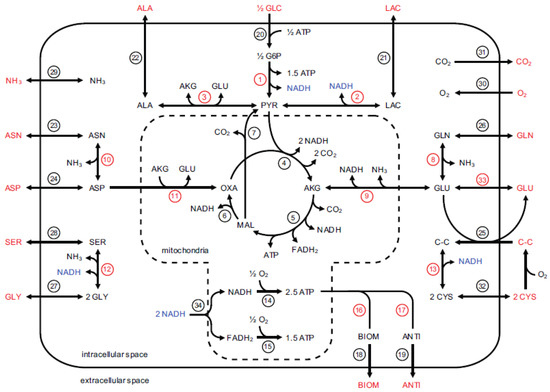 Metabolic pathways of CHO cell model. The 34 reactions are indexed. 14 extracellular metabolites, except for CO2 and O2, are modeled.