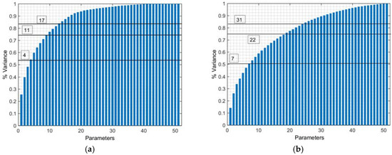 We plot the percentage variance explained of antibody and metabolite concentrations as a function of number of parameters in Figure 3a,b, respectively. The four most important parameters are two process variables, (#2 and #3), and two kinetic parameters (#20 and #41). Together, these account for 50% of the variance of antibody concentration, as shown in Figure 3a. We assign these parameters to subset A1. Subset A2 consists of seven parameters, including three process variables, #1-3, and four kinetic parameters, #13, #20, #41, and #46. Together, these 7 parameters account for 50% of the variance of the metabolite outputs, as shown in Figure 3b. We obtain the most important subset of parameters, subset A, by combining the kinetic parameters in A1 and A2. We arrive at subset A consisting of four parameters, #13, #20, #41, and #46. The process parameters, #1-3, are not included in this subset, because they are externally defined by the operating conditions and thus are not estimated from the experimental data. In a similar manner, 18 additional important parameters are identified and assigned to subset B. Together with the 4 most important parameters of subset A, the subset B parameters explain 80% of the variance of the antibody and metabolite concentrations. Seven additional parameters are identified in subset C. The remaining 18 parameters explain the last 10% of the overall variance and are part of subset D.