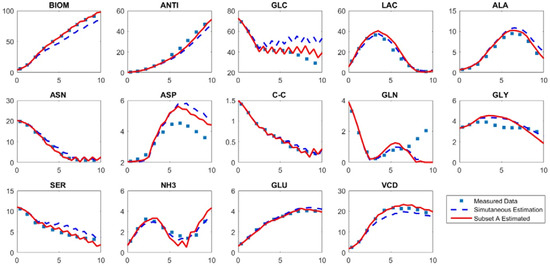 Taken together, the above results suggested that the sequential parameter estimation strategy could yield a more accurate model, while also reducing the computational time required for parameter estimation. To visually assess the accuracy of the sequentially estimated model, we plotted the model outputs obtained with the different parameter estimation strategies (Figure 4). For comparison, the experimental data used to estimate the original model [4] are also plotted in the same figure. The concentrations predicted by the model with simultaneously estimated parameters (Model 1) are shown in dashed lines, while the concentrations predicted by the model in which only the four most important parameters (subset A) are estimated (Model 2) are shown in solid line. Model 2 has a more accurate prediction in the concentrations of antibody (ANTI), the output of the greatest interest. In addition, Model 2 more accurately predicted the BIOM, GLC, ASP and SER concentration profiles.