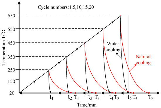 The samples were heated to the set temperature in a high-temperature furnace (type MXQ 1700) made in Shanghai (Micro-X Furnace Co. Ltd. (Shanghai, China)) at the rate of 10 °C/min and were maintained at the designated temperature for 2 h. The heating furnace has high precision of temperature control such that control accuracy error is ±1 °C, which meets the requirements of these experiments, as shown in Figure 1b. Then, the samples were quickly taken out of the furnace by the crucible tongs and placed in a container filled with cold water and cooled to room temperature and dried. In this process, the contact temperature of the sample with cold water will be lower than the set temperature, which will influence the experimental results. This procedure represents one cycle of heating and then cooling with water. Figure 2 shows the scheme of circulating heating and water cooling of the sample.