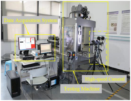 As shown in Figure 3, the experimental system comprises a loading system and a data acquisition system. The loading system is an MTS816 servo hydraulic testing machine that is located at the China University of Mining and Technology. The MTS816 testing machine has stable performance and a sensitive control system, and it is the most advanced laboratory testing equipment for rock mechanics in the world. The loading method is displacement control and the loading speed is 0.002 mm/min. Prior to carrying out the uniaxial compression test, the sample was coated with a layer of lubricant to reduce the friction between the sample and the pressure head. The loading and data acquisition system mainly recorded the stress strain, AE signals and digital images. The latter were obtained with a high-speed camera which was used to capture the evolution of fractures on the samples during loading, while a DS2 acoustic emission signal analyzer recorded the AE signals of the samples.