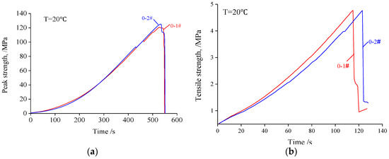 The stress-time curves of the two samples exposed to a temperature of 250 °C under uniaxial compression are shown in Figure 4a. The plot shows that the average peak strength, failure time, and average and secant modulus of the two samples are 123.09 MPa, 552.5 s, and 99.69 GPa and 69.25 GPa respectively, and the dispersion coefficients are 1.99 × 10−2, 0.90 × 10−2, 2.92 × 10−3 and 1.34 × 10−2 respectively. Figure 4b shows that the average tensile strength and failure time are 4.765 MPa and 119 s, respectively, and their dispersion coefficients are 0.11 × 10−2 and 3.4 × 10−2 respectively. The granite used in this study is quite homogeneous and the mechanical parameters show few differences, so the granite is suitable for quantitative analysis of its mechanical properties after cyclic heating and cooling. It can be seen from Figure 4 that there is no obvious yielding, which shows that the granite samples are highly brittle.