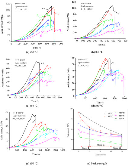 The transformation from brittleness to ductility is not only affected by the number of cycles of heating and cooling with circulating water, but also the temperature. Figure 4a–e show that when the samples undergo 15 cycles at a temperature that is under 250 °C, there are no signs of brittle failure, but the material becomes more plastic. At temperatures of 350 °C, 450 °C, 550 °C, and 650 °C, the samples become more plastic after 5, 1, 1 and 0 cycles of heating and cooling with circulating water, respectively. Therefore, during the cycles, temperature plays a decisive role in the brittle to plastic transformation of granite. Figure 5f shows that with an increase in the number of cycles, the peak strength of granite at 250 °C decreases linearly. When the number of cycles is increased from 10 to 20, the peak strength shows a downward trend. With 20 cycles, the peak strength of the granite at temperatures of 350 °C to 650 °C undergoes three stages: Stage I is the rapid decline of the peak strength, Stage II is when the decline of the peak strength is reduced, and in Stage III, the peak strength is constant. In all three stages, there are further gradual decreases in the peak intensity of the samples with increases in temperature. The plot in Figure 5f is fitted with an exponential function in accordance with the parameters in Table 1.