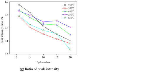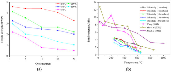 Figure 6a shows that the tensile strength of granite is significantly reduced with increased number of cycles, and the effect of temperature on the tensile strength of granite is significant. After 10 cycles, cracking due to reduced tensile strength of the sample is minimal at a heating temperature of 250 °C, in which the tensile strength of the samples is reduced from 4.57 MPa to 4.39 MPa. The rate of cracking with lower tensile strength is higher at higher temperatures. This is especially true of the sample that was exposed to a temperature of 650 °C, in which the tensile strength is reduced from 2.22 MPa to 0.80 MPa, or a reduction of 64.19%. After 10 to 20 cycles, the rate of cracking with lower tensile strength is high at 250 °C; however, the tensile strength of the sample is slowly reduced with higher heating temperatures, in particular 650 °C, so that the rate of cracking is slowly increased. Thus, the cycles of heating and cooling with circulating water of granite carried out at high temperatures have a very significant impact on its tensile strength.