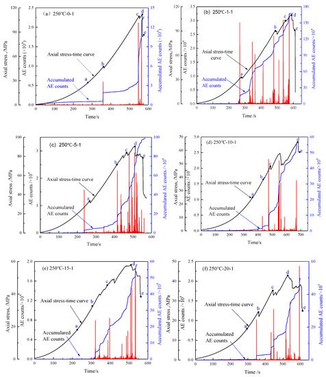 Figure 7a is the rock sample in the natural state of cooling, i.e., the number of cycles is 0. In the initial compaction stage (oa), the number of AE collisions is small, which is generated by the closure of a small number of primary cracks, and the AE collisions are in a quiet period. Starting from the elastic stage (segment ab), the number of impacts began to increase, and a smaller number of AE events occur, and the number of AE stabilizes at a lower level. When entering the stable crack propagation stage (bc), the number of impacts increases rapidly, and a large AE event occurs, which indicates that the cracks in the rock sample are gradually expanding and converging, and the AE number enters the active period. When entering the unstable crack propagation stage (cd), the number of impacts suddenly rises to the peak, and the cumulative number of AE rises steeply. At point d of peak intensity, the maximum number of AE impacts is reached, and the rock sample corresponds to the penetration of macroscopic cracks after the peak (de), and the number of impacts decreased, but there was still a small amount of AE activity and maintained a high level. Figure 7a shows two stress drops in the stress curve. New macroscopic cracks can be observed during each stress drop during the test and meanwhile many AE events will appear on the AE characteristic curve showing that AE monitoring can reflect the rock damage process accurately.
