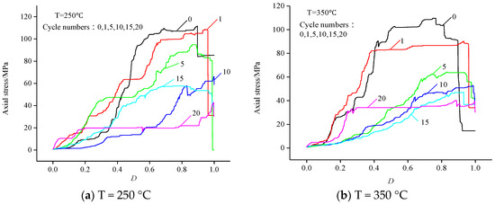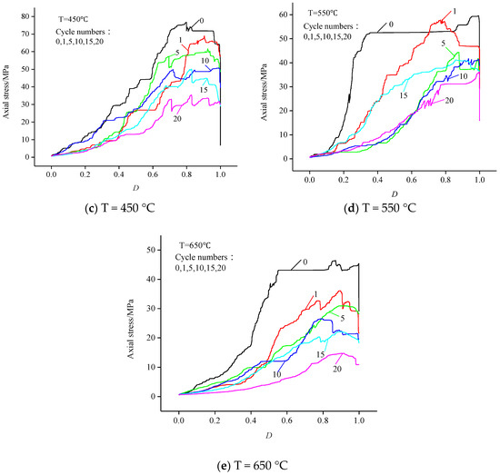 Mechanical damage curves of rock samples at different temperatures are drawn based on AE experimental data, as shown in Figure 8, which shows that in the initial compaction stage, the primary pores and fractures in granite are compacted, and the damage variable is almost 0. Then, the damage variable increases slightly, and the deformation damage in this stage is mainly caused by elastic deformation of rock sample mineral particles. The mechanical damage of rock samples in these two stages is less affected by temperature and water-cooling times N. The rock is in the stage of unstable fracture when the stress reaches about 60% of the ultimate strength. The damage variable increases rapidly because of friction, dislocation occurs between granite particles, and new cracks occur. Therefore, 0.6σb can be used as the threshold stress value of granite damage [40]. When the ultimate strength is exceeded, the damage value gradually approaches 1 and the rock sample tends to be damaged. At the same time, it can be seen from Figure 8 that under the same temperature and stress, the mechanical damage becomes greater with the increase of the number N of high temperature and water cooling, indicating that high temperature and water cooling have caused thermal damage to the rock sample.