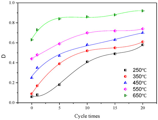 As can be seen from Figure 9, the D value of specimen damage increases with the increase of N at the same temperature. This is due to the appearance of tiny cracks in the surface of the granite specimen during the cold and thermal cycle, which is spread throughout the whole sample, cutting the rock mass and destroying the internal structure of the specimen leads to the reduction of the bearing capacity of the rock. The surface rock of the specimen is further softened by water action, which increases the accumulation of irreparable deformation, leads to the further expansion of the existing crack depth and the increases of the number of cracks, so the damage value increases gradually when the structural connection of rock is destroyed. At the same number of cycles of high temperature and cold water and as the temperature goes up, the damage value N gradually increases because the thermal tensile stress of granite exceeds the tensile strength of the material itself, the material will undergo thermal damage. The higher the temperature of the specimen itself, the greater the tensile stress on its surface. Tensile cracks will occur on the surface of the specimen when the tensile strength of the rock exceeds the tensile strength. The external temperature of the specimen decreases sharply but the internal temperature is relatively high during rapid cooling, the tensile crack on the surface of specimen and the excess part of material is caused by external shrinkage and internal expansion. In the heating process, more dorsal cracks are produced at the excess part of the material due to external expansion and internal contraction. Because the external temperature rises sharply, and the internal temperature decreases relatively, there will be more tiny cracks in the rock than expected.