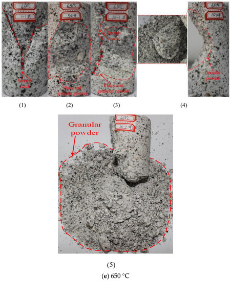 The mechanical parameters of granite at a temperature of 650 °C in Figure 10e are obviously changed after air cooling from brittle to plastic. After 1 cycle, a cross shear failure surface develops with a smaller number of layered blocks of granite. After 5 cycles, uniaxial loading causes the sample to change from flaking/spalling to particle detachment, and shows layers of a failed surface. With increases in the number of cycles, failure appears in the center of the sample. After the sample has undergone 15 cycles, the material has lost most of the cohesion and bonding between particles and the granite is changed to a granular material. After 5 cycles, the color of the sample changes from gray to light yellow and then to dark yellow.