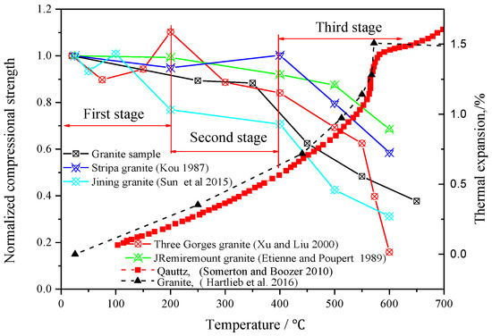 Figure 11 shows the normalized compressive strength data from several experiments [41,42,43,44] compared with the results of this study. Although the fluctuation of compressive strength of each type of granite is different, the normalized compressive strength can be observed decreasing below 200 °C in treatment temperature. When the treatment temperature exceeds 200 °C, the compressive strength quickly starts to decrease with increasing temperature. However, it is observed that a faster rate of decline occurs at temperatures higher than 400 °C (Figure 11). This is caused by changes in the internal structure of the granite minerals as a result of the heat. The sharp increase in the thermal expansion [45,46] of quartz at temperatures between 400 °C and 500 °C is shown in Figure 11. Due to the rapid expansion in the quartz volume, cracks occur between the quartz, feldspar and hornblende, causing the rapid decline in the strength at this stage.
