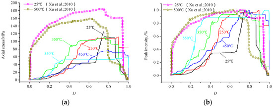 The mechanical damage of samples after natural cooling from the literature [40] is compared with the results of this study as shown in Figure 12a. The mechanical damage curves of the samples studied in the literature have been obviously effected by temperature. In this paper, when the damage value of almost all samples was 0.7, the corresponding axial stress value reached the maximum. Figure 12b shows that the fluctuation of mechanical damage value of each sample is not obvious. When the stress value is 0–30% of the peak strength, the mechanical damage value of the unheated sample is the largest, and the D value is about 0.4; when the mechanical damage value of the 550 °C sample is the smallest, and the D value is about 0.2. When the stress value reached 30% of the peak strength, the mechanical damage value of the sample began to be significantly dispersed, and the mechanical damage value was significantly affected by temperature. Compared with the mechanical damage curves of the samples in the literature, we can find that the samples in this paper will suffer greater mechanical damage at a lower stress level which shows that the samples in the literature have higher strength and brittleness than the samples in this study. We found that the influence factors of mineral composition, processing precision, heating and cooling condition and stability of loading equipment are related to the difference tests of the mechanical damage curve.