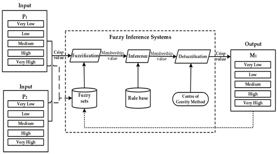 The proposed simplified hierarchical fuzzy logic (SHFL) model, as illustrated in Figure 2, provides partial solutions in the middle layer; these partial solutions are then used in the next subsequent modules to generate the final system output. The simplified hierarchical fuzzy logic (SHFL) model is primarily designed to reduce the computational complexity when the variables are greater in number. In the conventional fuzzy logic model, as shown in Figure 3, all inputs are directly entered into a single fuzzy logic method; hence, as new variables enter the system, the number of rules increases exponentially in the rules base.