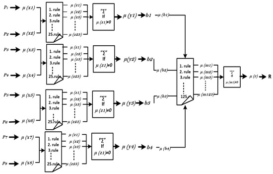 The fuzzy inference model diagram is given in Figure 5 to elaborate the simplified hierarchical fuzzy logic (SHFL) model in detail. As mentioned earlier, in the middle layer there are four fuzzy logic types: the P1 and P2 variables are input to WPRF fuzzy logic, the SPRF inputs are P3 and P4 variables. MRF takes P5 and P6 as inputs, and P7, and P8 are input to GRF. µ (xi) indicates the degree of truth for each input premise in the fuzzification processes in the middle layer. The computed truth value for the premise of each rule is represented as (zi) in the inference process of the middle layer. In the composition processes, all the subsets allocated to each output variable are combined to form a single fuzzy subset for each output variable, which is represented as u(yk), where k = 1, 2, 3, 4 are in the middle layer. b1, b2, b3, b4 are the crisp output values after defuzzification processes in the middle layer. The output crisp values of each fuzzy logic type in the middle layer are further input to top-level layer fuzzy logic. The same fuzzification inference, composition, and defuzzification processes are applied in this fuzzy logic in order to get the final risk index value.