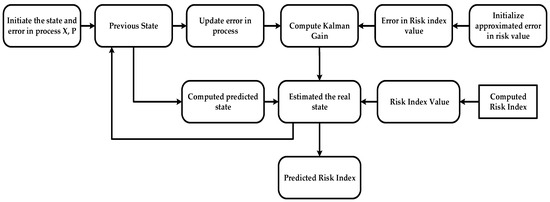The Kalman filter has been used in this model to predict the underground risk index. A Kalman filter takes the output values of the SHFL model as inputs and calculates the predicted underground risk index values. The prediction is essential to assist the manager with taking action in advance. The Kalman filter addresses the common issue of trying to predict the state x” Rn of a discrete time. The Kalman filter uses the below formulas (Equations (2)–(4)) for prediction.