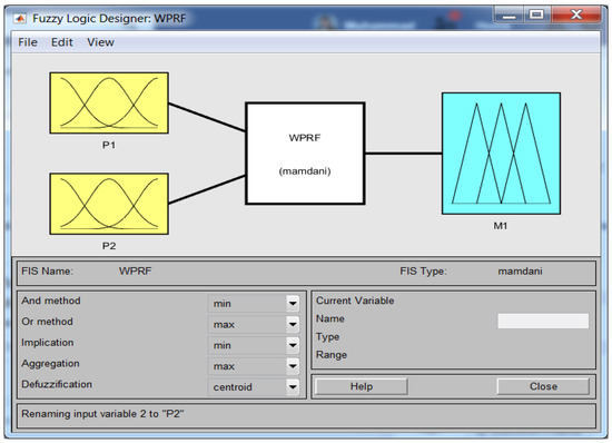 In the proposed SHFL model, the Mamdani fuzzy logic method [48] has been used because of its simplicity and efficiency [5]. The main components of the Mamdani fuzzy logic method are fuzzification, knowledge base, fuzzy inference system, and defuzzification. In fuzzification, the crisp inputs are translated into fuzzy values using membership functions (MFs). The fuzzy sets are defined in the knowledge base. The rule base is comprised of if–then rules. If–then rules are used for capturing the indefinite models of reasoning. These rules play a significant role and enable us to decide in situations of uncertainty and imprecision. The structure of Mamdani fuzzy logic is presented in Figure 4 for the WPRF fuzzy logic. Similarly, the Mamdani fuzzy logic for SPRF, MSRF, and GRF has been used, having the same characteristics as in Figure 4.