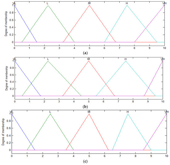 A fuzzy inference system performs mapping of fuzzy inputs to fuzzy outputs using fuzzy theory models. The MFs play an essential role in the fuzzy theory. In the SHFL model, triangular MFs have been used. The triangular MFs reduce the computational complexity, are very useful, and are most commonly used in Mamdani fuzzy logic [49]. The formula for triangular MF is defined in Equation (1). Defuzzification is used for converting fuzzy output values to crisp values. There are different defuzzification methods [50]; in the proposed SHFL model fuzzy logic the center of gravity algorithm has been used in defuzzification [51]. The triangular curve is a function of vector x, and depends on three scalar factors, a, b, and c, as given by