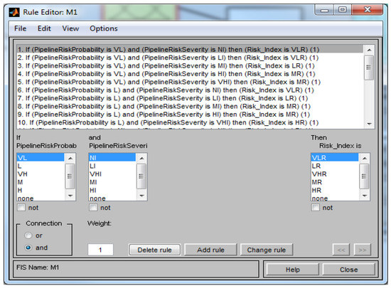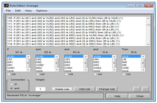 For rule specification in the top level layer fuzzy logic to calculate the final risk index, both ARB and MRB rules specification methods have been applied. The complete rule set (775 rules) of Table 2 derived through the ARB method is specified using the rule editor for top-level fuzzy logic, as shown in Figure 12.