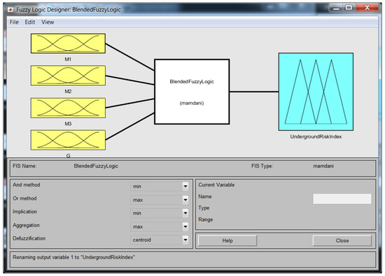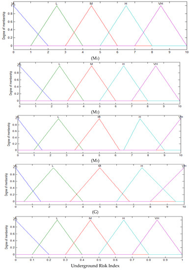 There are four inputs (M, M2, M3 and G) to the top-level layer fuzzy logic and the output is the underground risk index; hence, for each input variable five MFs are defined with the same linguistic terms and different scale. The input and output membership functions are shown in Figure 11.