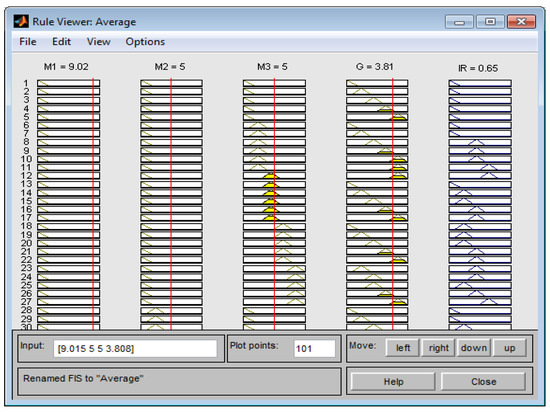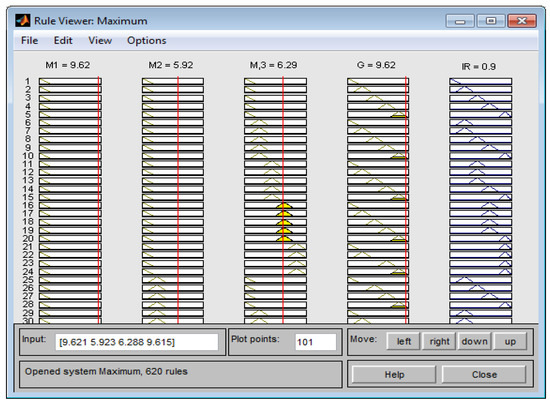 The rule viewer for specifying rules through an ARB rules specification scheme is shown in Figure 13, where the inputs are M1, M2, M3 and G, and the resulting values are the final risk index values of the proposed SHFL model.