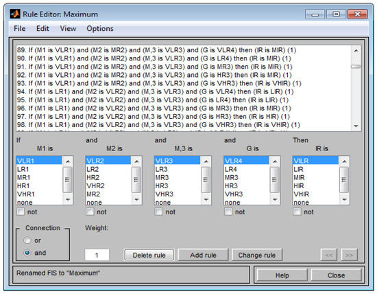 A total of 25 rules are defined for WPRF fuzzy logic. The ARB rules scheme has been applied to specify rules for WSPR fuzzy logic, as given in Table 2. Figure 9 presents the fuzzy rules editor of the fuzzy logic toolbox for rules determination using the ARB method for the WPRF method. The labels of the input variables and the output variable are represented as a list for the user to choose and combine using the logical operators ‘and’ and ‘or’.