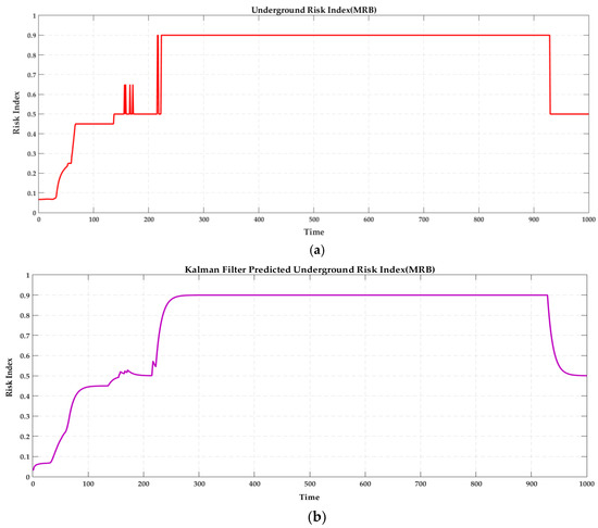 (a) Output values of the SHFL model using MRB rules definition method; (b) predicted values using Kalman filter for underground risk index.