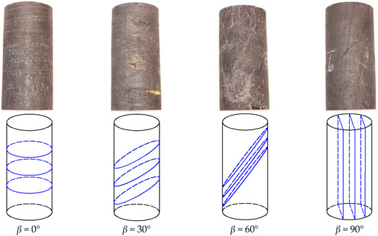 A series of cylindrical samples with a diameter of 50 mm and a length of approximately 100 mm were machined from this coal block. The coal samples were categorized based on the included angle β between the radial direction of the drill and the direction of the bedding surface, namely β = 0°, 30°, 60°, and 90°, as shown in Figure 1.