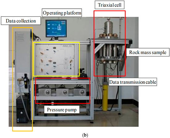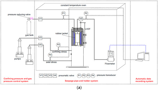 Gas adsorption–desorption and permeability tests were performed on the prepared coal samples using a triaxial cell. Figure 2 shows the apparatus, where Figure 2a shows the main components: confining pressure and gas pressure control system, seepage pipe and holder system and automatic data recording system. Figure 2b is a photo of this apparatus. This cell is capable of accepting membrane-sheathed cylindrical samples (50 mm diameter). Axial and hydrostatic stresses up to 56 MPa were independently applied using two ISCO-260D pumps (Teledyne ISCO, Lincoln, NE, USA) with control up to 61 kPa. The gas pressure in the upstream was controlled by an ISCO-500D pump. The flow rate was measured using a mass flowmeter with an accuracy of 4 mL/min. The flowmeter was connected with the outlet end of the fluid pipelines and the atmosphere. Temperature was controlled, and its variation was within ±0.1 °C during testing.