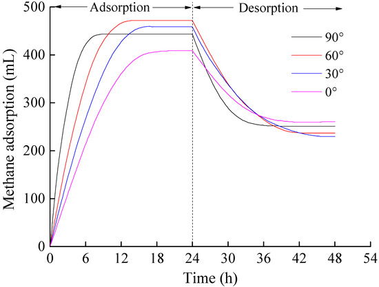 A comparison of the standard adsorption–desorption curves for samples with different bedding angles is shown in Figure 3 and Figure 4. After the gas entered the samples at 3 MPa of pressure, the interior of each sample was in a state of negative pressure. Due to the pressure difference and concentration difference, gas began to seep in and diffuse quickly; once the gas had seeped into a sample, the gas pressure difference and concentration difference gradually decreased, thus reducing the adsorption speed until a saturation state was reached. Gas desorption is the inverse process of gas adsorption; however, because microstructures existed within the coal, microcracks and pores of the coal matrix could close and affect the seepage and diffusion channels. Ultimately, the desorption quantity was reduced to less than 50% of the adsorption quantity, and the time to reach the desorption balance was twice that required for adsorption.