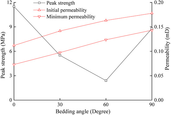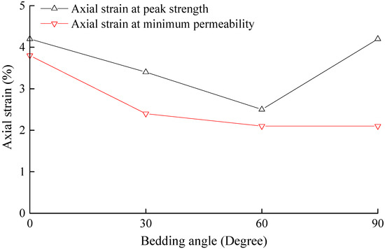 Axial strains at peak strength and minimum permeability at different bedding angles.