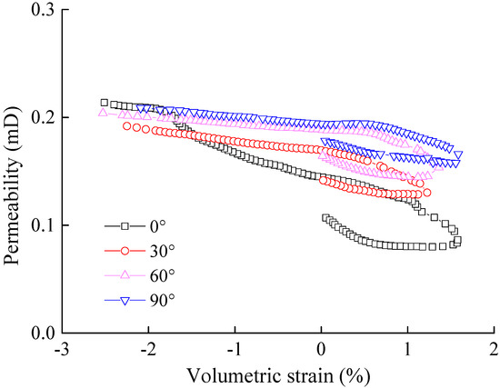 Figure 7 and Figure 8 illustrate the relationship between permeability, radial strain, and volumetric strain, respectively. For the same values of radial strain and volumetric strain, permeability increased with an increase in the angle.