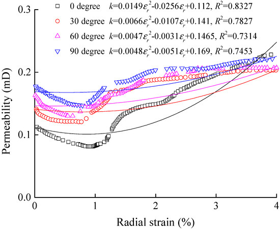Permeability is parabolically related to radial strain. The permeability–radial strain data of coal samples with different bedding angles were fitted using the parabolic equation as shown in Figure 9, indicating that the parabolic equation clearly described the permeability–radial strain data of coal with different bedding angles.
