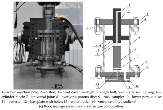 - The seepage pressure loading system provides a continuous and stable seepage pressure for the specimen based on the injector concept, and this is an important part to achieve the seepage-creep coupling effect, as shown in Figure 2b.
