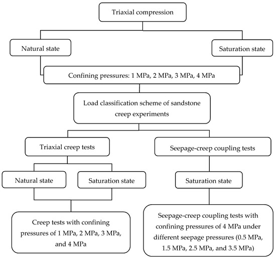 - Triaxial compression tests of sandstone. Triaxial tests of sandstone will be carried out under the natural state and the saturation state and the confining pressures are 1 MPa, 2 MPa, 3 MPa, and 4 MPa. Then the compressive strengths of sandstone under four confining pressures in two states are determined. According to the triaxial compressive strength, the load classification scheme of sandstone creep experiment can be obtained.