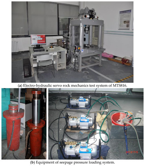 - The axial pressure loading system uses the Electro-hydraulic servo rock mechanics test system of MTS816 to provide a stable and continuous axial load for the specimen during the test, as shown in Figure 2a.