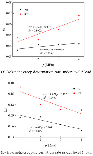 The slope of the creep deformation curve of the sandstone under the last two loading levels was studied. From Figure 15, it can be seen that, as the seepage pressure increases, the slope of each creep curve gradually increases, indicating that the creep deformation rate of sandstone increases steadily. The seepage pressure has three types of effects on the creep deformation of rock: First, the seepage pressure can directly act on the sandstone in the form of axial pressure. Under the same confining pressure, the greater the axial pressure, the greater the deformation and deformation rate of sandstone. Second, the seepage pressure can provide an extended pressure on the internal crack tip of the sandstone. The greater the seepage pressure is, the faster the crack tip develops, and the sandstone deformation and deformation rate increase correspondingly. In addition, the seepage pressure can produce a certain scouring effect on the crack surface. The greater the seepage pressure, the greater the corresponding scouring effect, resulting in a smaller surface roughness of the crack. As a result, it is easier to slide on both sides of the crack, and the macroscopic performance is that the deformation rate of sandstone gradually increases.