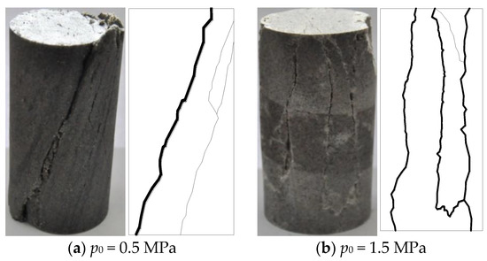 Figure 18 shows the macroscopic morphology after the creep failure of sandstone under different seepage pressures. Generally speaking, under the same confining pressure, the number of through cracks on the surface of specimens after creep failure increases with the increase of seepage pressure, indicating that the degree of macroscopic damage gradually increases.