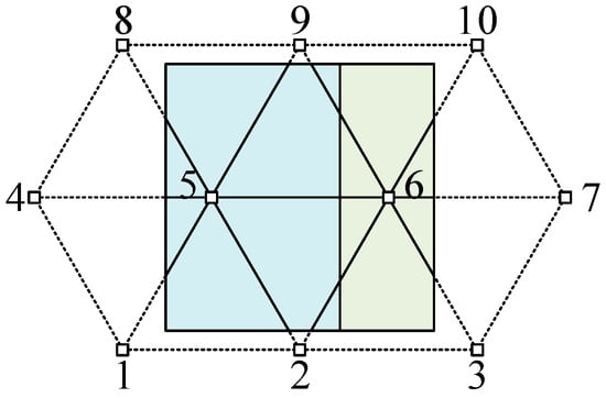 A simple example is given to illustrate the above concepts. As shown in Figure 1, a rectangular domain is divided into two different materials by a vertical interface. A regular triangular mesh is used to form MCs in this example. Each node in the mesh is defined as a star, and MCs are formed by triangles adjacent to a star, denoted as , where the subscribe is the number of the star. Thus, the standard shape of MC in this example is a hexagon (i.e., and ) combined by six triangles. However, quadrangular or triangular MCs may be made using fewer triangles on the boundaries (i.e., ).