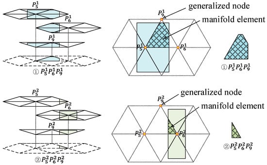 After generating the cover systems, manifold elements—the basic integral region of the weak form of the problems—are defined as the overlapping areas of PCs. As exhibited in Figure 3, MEs are regarded as the common area of three layers of PCs when adopting triangular finite element mesh. Therefore, the star of the corresponding PCs is considered as a generalized node of the ME in NMM. This is different to the concept of nodes in FEM. For simplicity, the generalized node will be termed as “node” for the rest of this paper. In addition, the shape of MEs are generally triangular, except for the MEs adjacent to boundaries or interfaces, which may have an arbitrary shape. As long as the MCs are based on triangular mesh, the number of generalized nodes of an ME is three. As shown in Figure 3, ME is overlapped by , , and . Thus, ME is termed as , and ME is similarly termed as . In this way, the discontinuity of the triangular element cut by boundaries or material interface is presented by NMM.