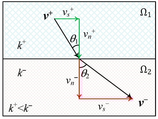 Imposing the refraction law to the governing equation as an additional constraint condition is an efficient approach to dealing with the second limitation. For example, Zhou et al. [] proposed a modified Yeh’s method using a post-processing scheme to enforce the refraction law across material interfaces. Thus, iterations are required for the scheme to achieve convergence. Additionally, Xie et al. [] developed a domain decomposed finite element method for solving the Darcy velocity in heterogeneous porous media without iterations. The basic idea is to separate the problem domain into several subdomains by material interfaces with coercive refraction law. Nevertheless, the above FEM-based methods are still mesh-dependent, which is inconvenient for pre-processing, especially when material interfaces are complex.