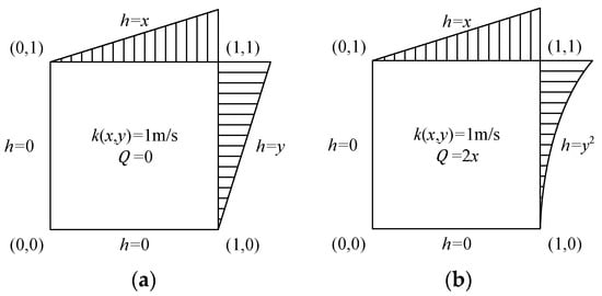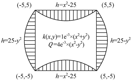 To demonstrate the capability of handling complex boundaries by the proposed method, the same model with a quadratic Dirichlet boundary condition is simulated, as shown in Figure 6b. The boundary conditions are , , , and , and the permeability coefficient remains unchanged. Note that the source term in this model is . The analytical solutions of the hydraulic head and Darcy velocity are , , and , respectively.