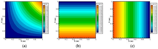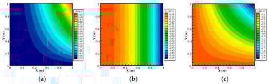 Computed contour map of the (a) hydraulic head, (b) Darcy velocity component in the x direction, and (c) Darcy velocity component in the y direction using the proposed NMM model with a 60-layer mesh.
